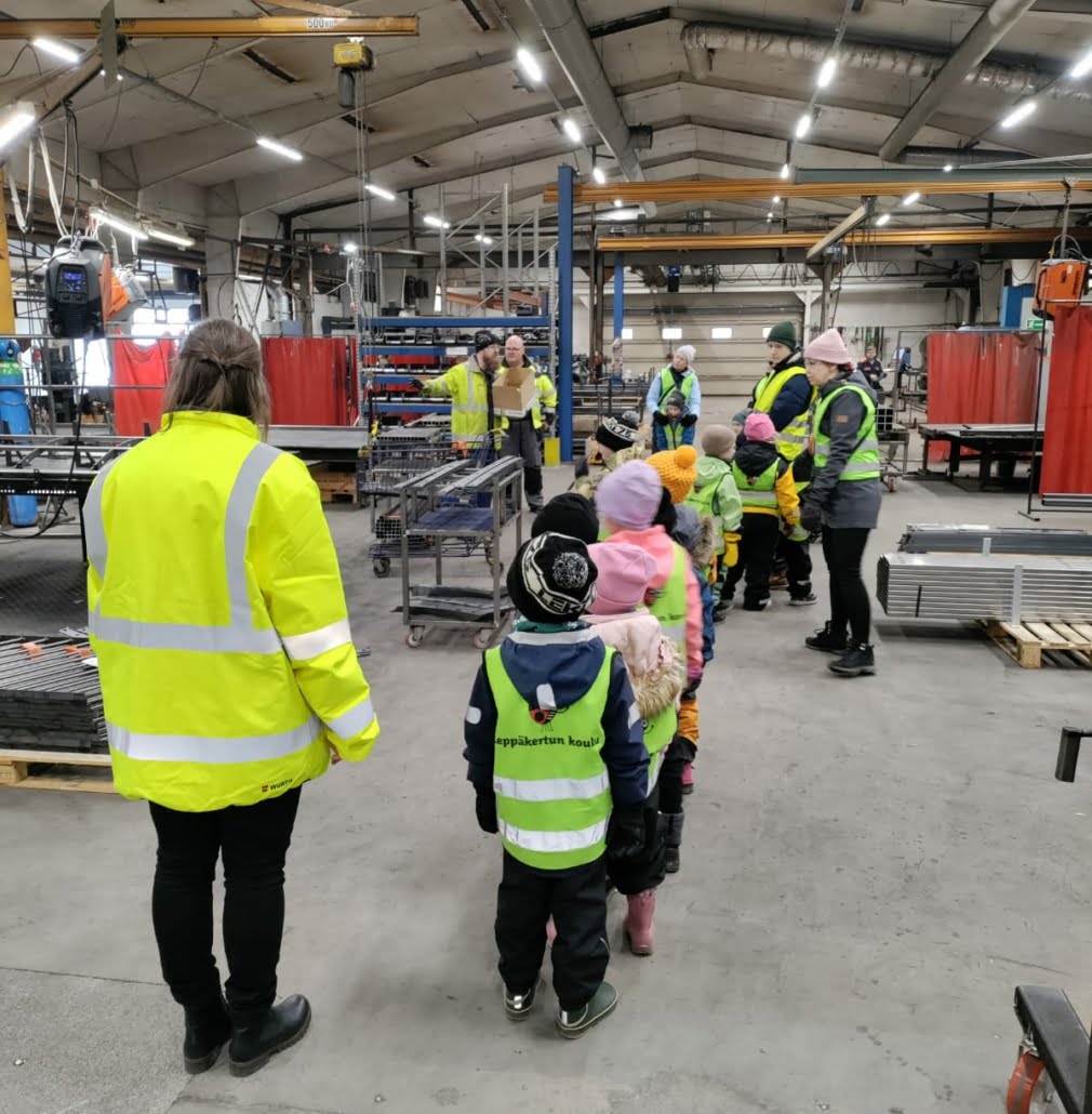 Vierailun päätteeksi nautittiin pillimehut ja keksit ja eskarilaiset saivat mukaansa pieniä tarroja yrityksen logolla varustettuna. Kun heiltä kysyttiin, mikä oli parasta vierailussa, vastaus oli yksimielinen: ”kaikki!” Reilu puolet lapsista oli jo sitä mieltä, että heistä tulee isona insinöörejä tai hitsaajia.