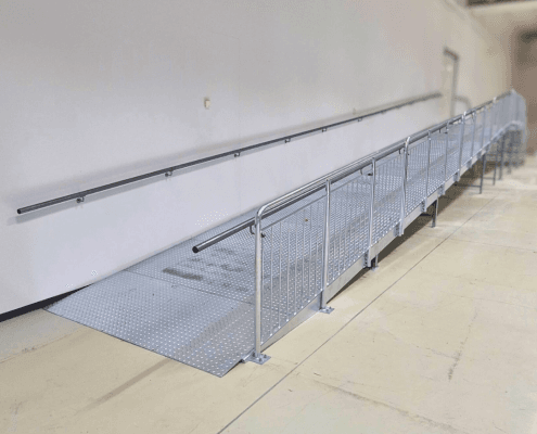 Porvoossa yhdistettiin kahden myymälätilan tasoero käytännöllisesti teräsportaalla ja luiskalla. Luiskan kaltevuus mitoitettiin niin, että huolto- ja kuljetusliikenne toimii sujuvasti eikä kulku käy liian raskaaksi. Tasolle asennettiin lisäksi kaksi porttia (1- ja 2-lehtinen), jotka helpottavat lastauksia ja rajaavat tilaa tarpeen mukaan. Kokonaisuus tehtiin kuumasinkitystä kyynellevystä, jolloin rakenne kestää kulutusta ja pysyy siistinä myös kovassa käytössä. Kyynellevyyn päädyttiin, jotta myös pienemmät myymälän kärryjen renkaat kulkevat helposti luiskassa.