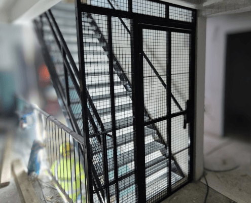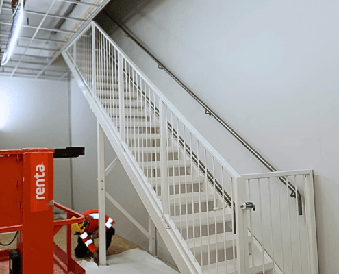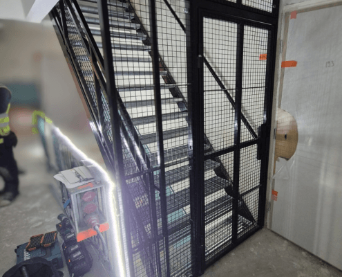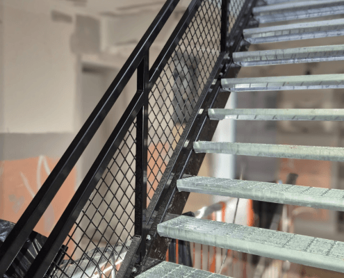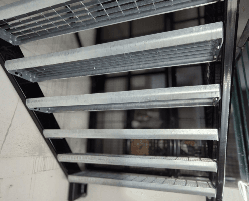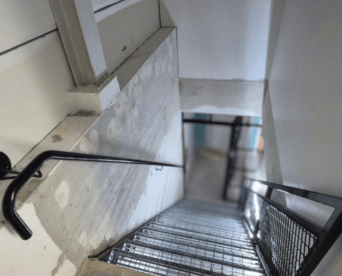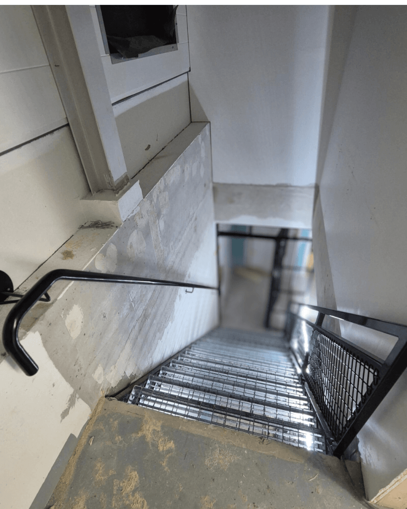 Pääkaupunkiseudulle toimitettiin kolme suoraa porrasta, jotka täyttävät R30-palonkestovaatimukset. Jokainen porras varustettiin suojaseinällä, joka estää kulun iv-konehuoneisiin. Askelmina käytettiin kuumasinkittyjä ritiläaskelmia, ja kaidemalliksi valittiin poikkeuksellisesti verkkokaide, joka jatkoi samaa visuaalista linjaa maalatun suojaseinän kanssa.
