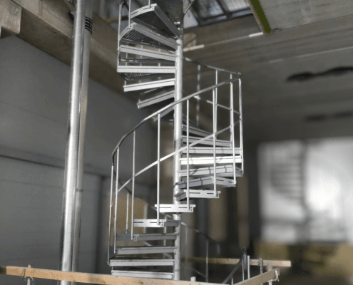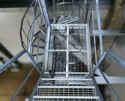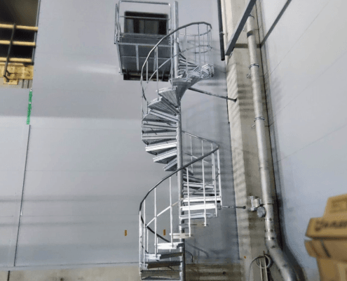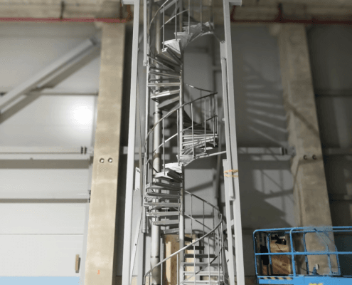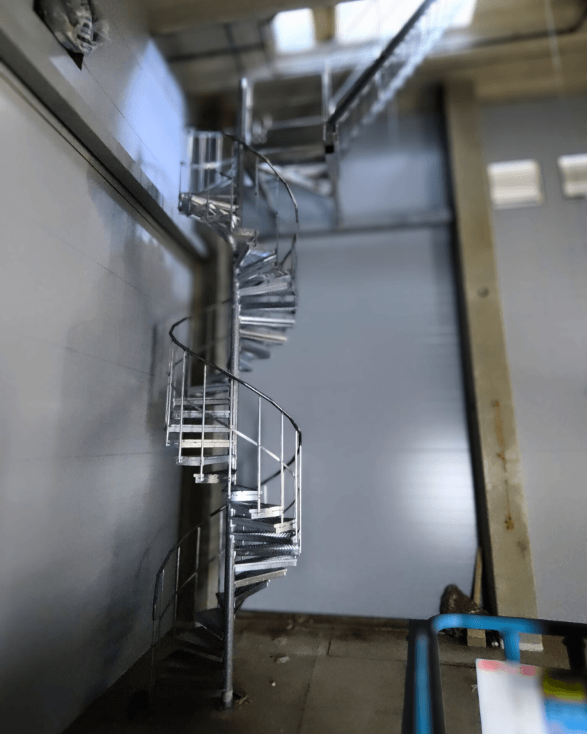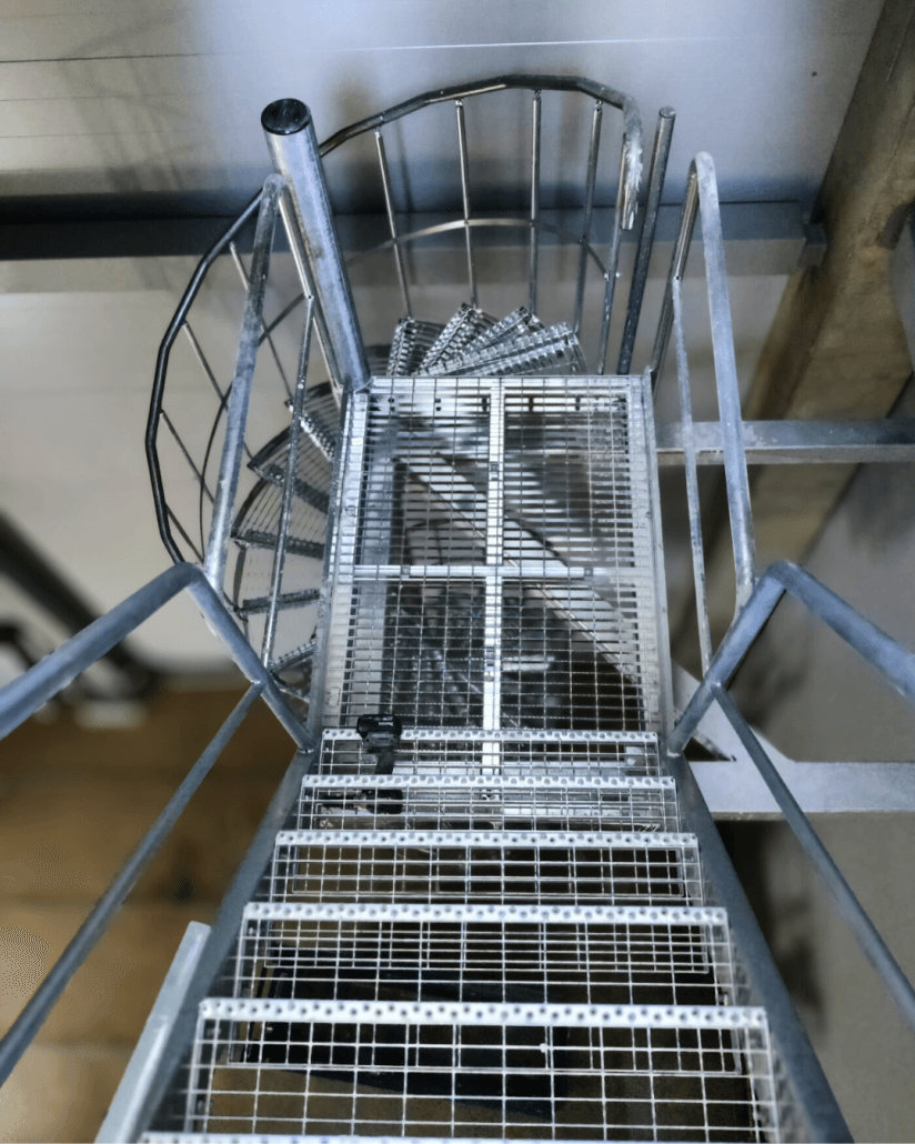 Me suunniteltiin ja valmistettiin kohteeseen sekä suuret kierreportaat että useita pienempiä teräsportaita ja tasoja. Ratkaisut toteutettiin teollisuuskaiteilla ja ritiläaskelmilla.