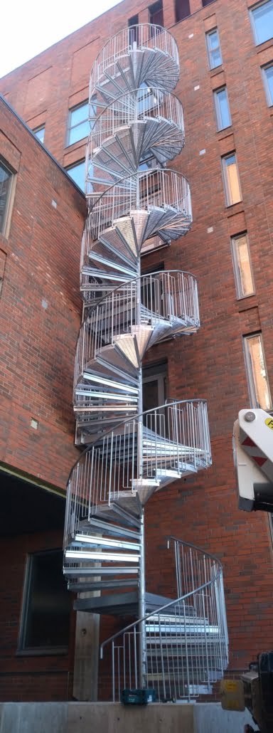 Kahdeksantena on kuumasinkitty kierreporras hitsatulla pinnakaiteella. Porras toimii myös hätäpoistumistienä ja pinnojen välien ollessa alle 100mm on kaidemalli myös lapsiturvallinen. Kierreporras on seissyt paikoillaan jo vuodesta 2018.