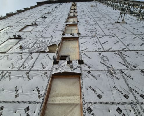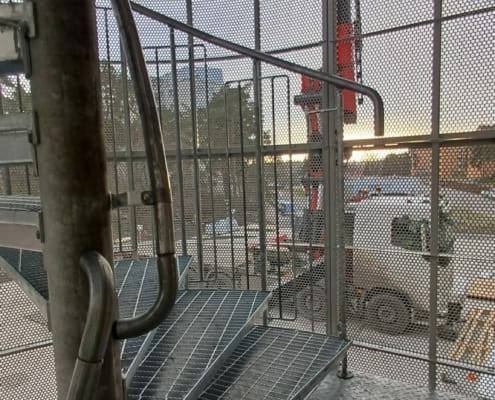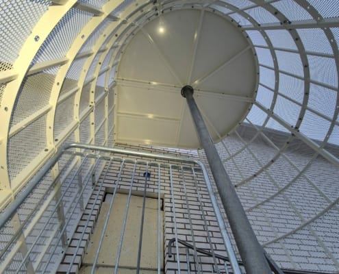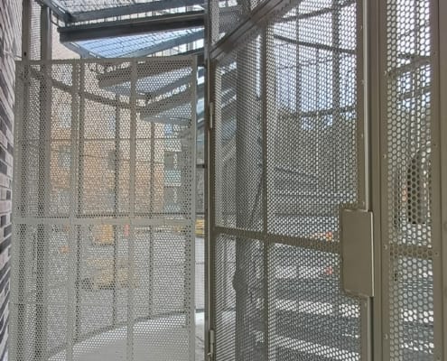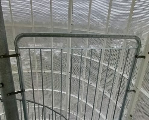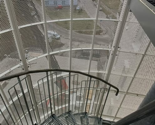 Kierreportaan ympärille asennettiin suojakehä, joka oli maalattu kahdella eri sävyllä mukaillen seinän kuviointia. Suojakehään asennettiin lisäksi kattorunko ja vesikate. Isompia ongelmia kohteessa ei tarkemittausten ansiosta ollut ja kokonaisuus oli asennettuna noin kahteen viikkoon, mikä on yli 30 metriselle portaalle ja suojakehälle erinomainen suoritus.
