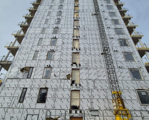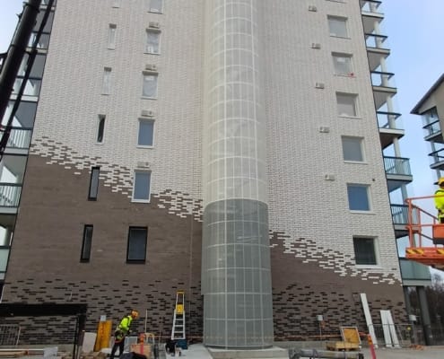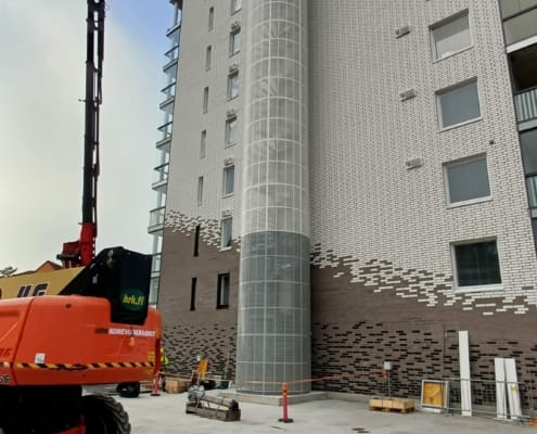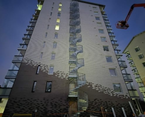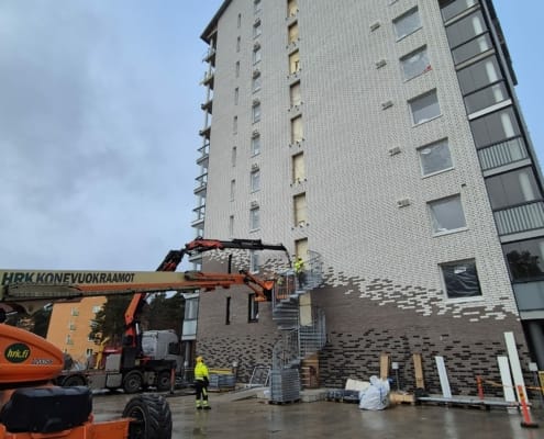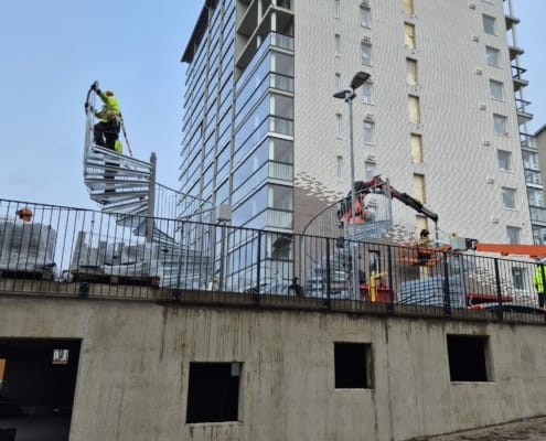 Kierreportaan asennus toteutettiin marraskuussa pihakannelta vaiheittain, kerros kerrallaan. Ennakkoon asennetut puukot helpottivat ja nopeuttivat asennusprosessia merkittävästi. Tämä ei ainoastaan vähentänyt asennukseen kuluvaa aikaa vaan pienensi myös kokonaiskustannuksia mm. nostimien osalta.